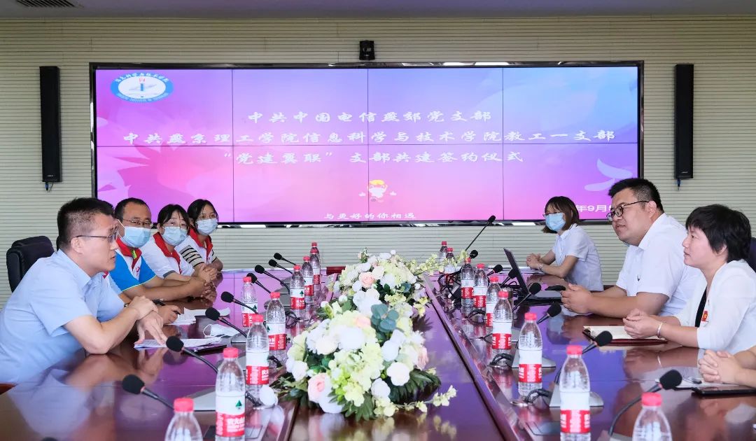 为了喜迎党的二十大的胜利召开,落实新时代党的建设总要求,充分发挥基层党支部的主体作用,激发党员的活力,探索高校与企业党建新模式。95日上午,信息科学与技术学院教工第一党支部和中国电信燕郊分公司党支部在燕京理工学院综合楼528会议室,举行党建翼联签约仪式。信息科学与技术学院院长李丽芬、党总支书记朱雷、教工第一党支部书记赵燕和燕郊电信支部书记、燕郊分公司总经理钟凯以及两个支部的党员代表参加了签约仪式。