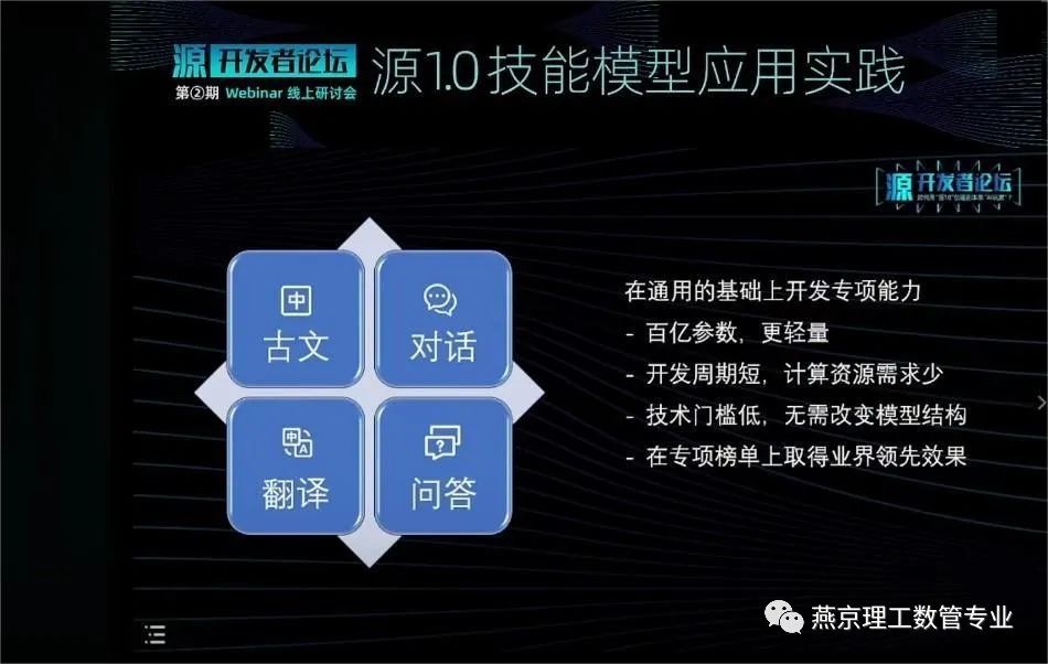 培训中,首先由浪潮信息源1.0高级算法工程师于彤博士介绍技能模型的开发与应用实例。根据于博士介绍,四个技能模型是在基础的源1.0千亿参数大模型中蒸馏出来,主要包括古文、对话、翻译、问答四个方面。技能模型均为百亿参数模型,更轻量。同时,技能模型开发周期短,计算资源需求少,技术门槛低,无需改变模型结构,在专项榜单上取得业界领先效果。并对古文、对话、翻译、问答四个技能模型做出具体介绍。