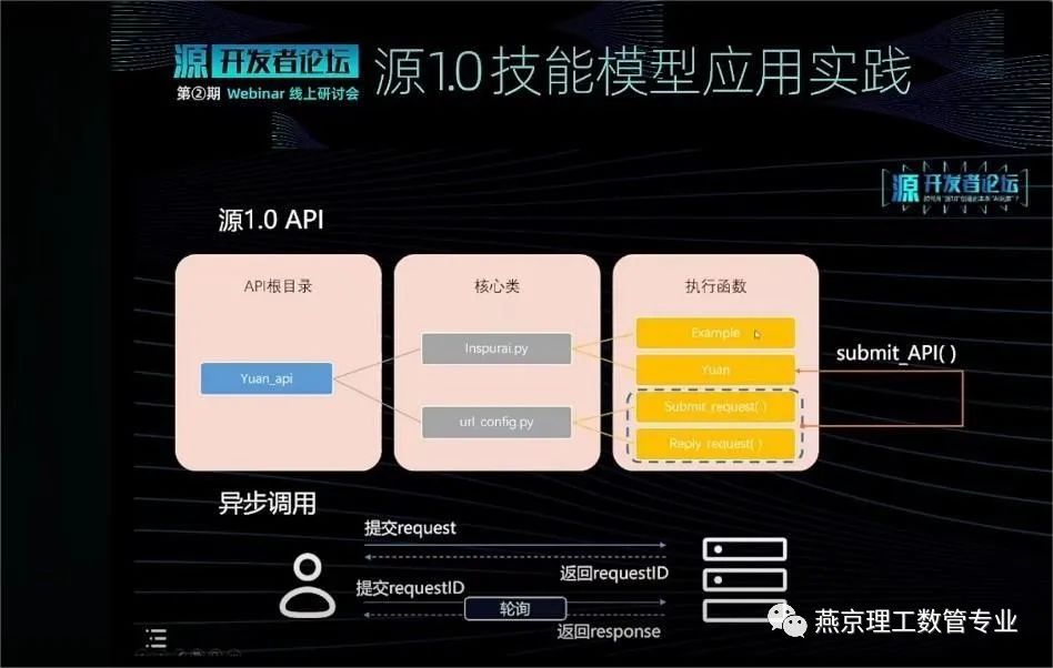 随后,由浪潮信息算法研究员李峰博士介绍源1.0API和Web示例应用开发。李博士通过回顾源1.0的内容,引出源1.0API和Web示例应用开发的内容。根据李博士介绍,源1.0API所有的代码封装集成在API根目录中,在根目录下有两个核心类,为Inspurai.py和url_config.py。Inspurai.py为ai程序以及ai代码的调用相关的一些类和方法,url_config.py为ur地址的提交和ur RESTful API接口相关内容。Inspurai.py下两个最重要的类为Example类和Yuan函数类。其中,Yuan类可以调用url_config.py中Submit request()和Reply request()两个方法。并对源1.0Web示例应用开发工具Sandbox做出介绍。