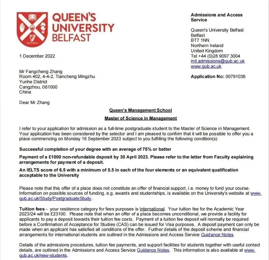 信息科学与技术学院计算机科学专业张芳铖同学获得贝尔法斯特女王大学 (2023年QS世界排名第233) 管理专业(同时获得3000英镑奖学金)和萨里大学 (2023年QS世界排名第305) 管理专业Offer。