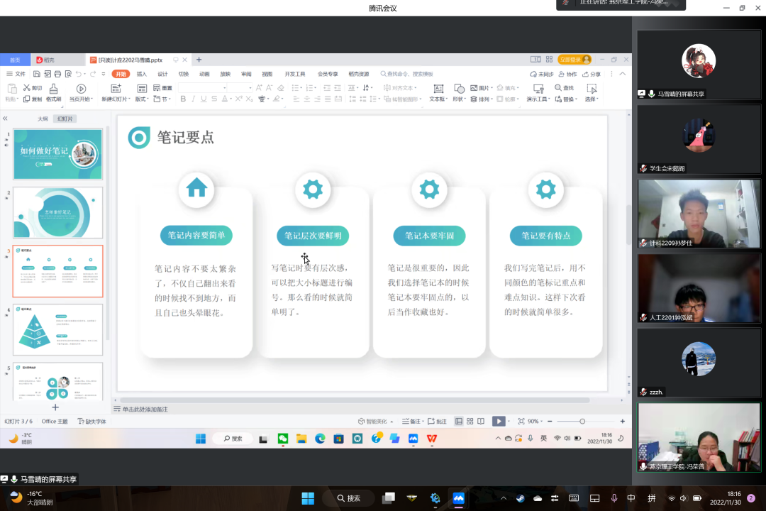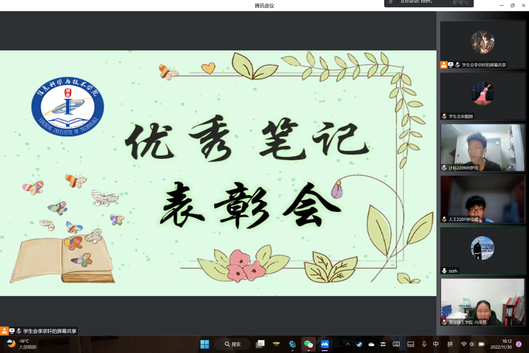 为进一步加强信息科学与技术学院学风建设,在学院范围内营造勤学、善学、乐学的浓厚学习氛围,激发燕理学子学习兴趣,提高燕理学子学习效率,助力广大子养成良好的课堂笔记习惯,2022年11月30日,信息科学与技术学院于线上举行“优秀笔记”表彰会。信息科学与技术学院22级全体辅导员老师以及我院学生代表参与了此次活动。