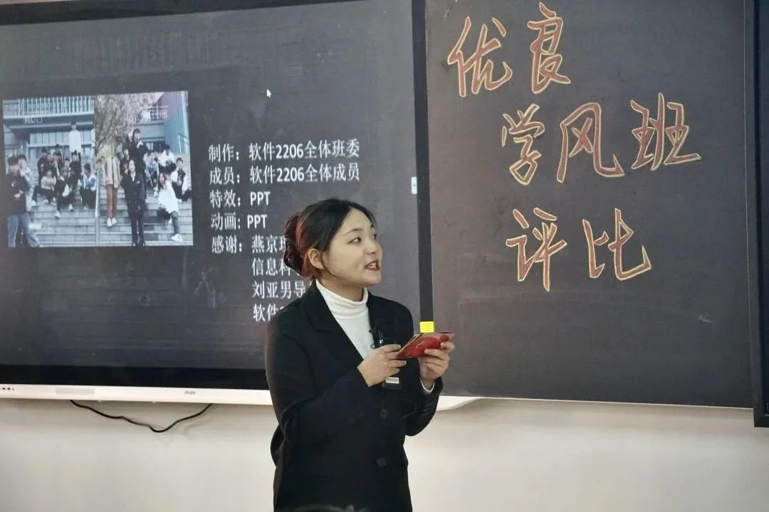 此次评选活动由21级共9个班,22级共10个班参加评比。评比主要以PPT形式进行5分钟的演讲,主要以第二课堂,班风建设,学风建设,思想建设等方面来展现班级的风采。展示环节结束,评委老师分别为各个评选班级打分。