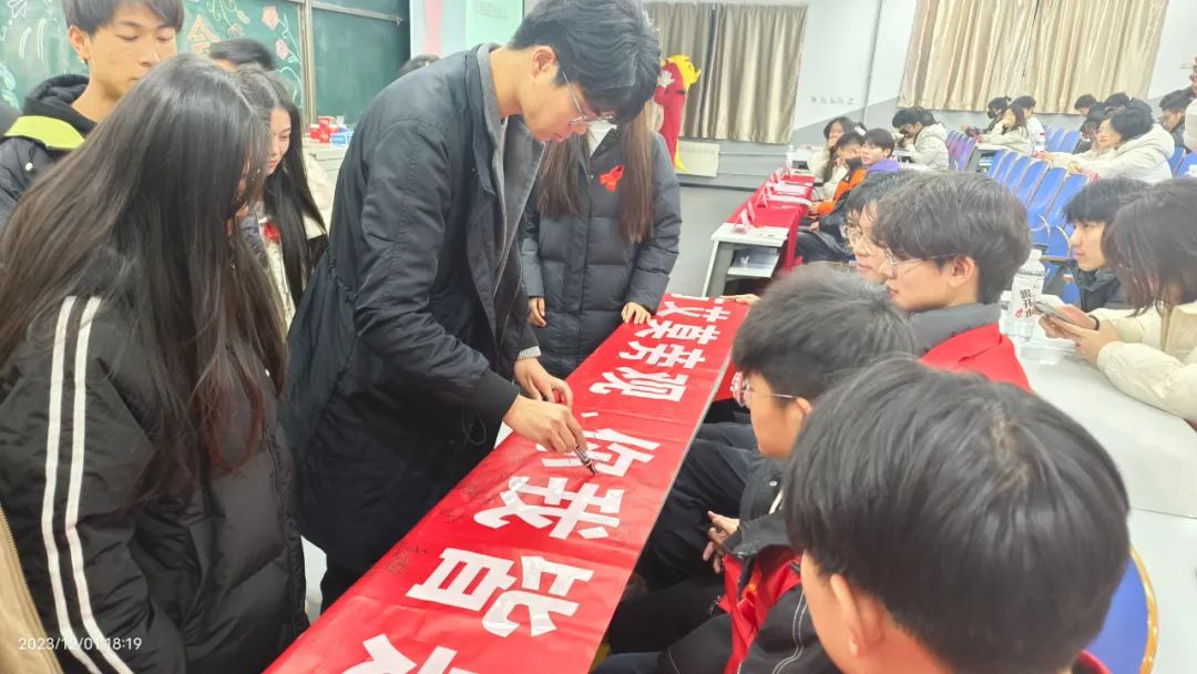 红衫志愿者们在B楼党建广场搭建书写标语地点,帮助学生们了解到更多关于艾滋病的知识,志愿者为同学们提供便利贴,让他们写出对艾滋病患者的关心话语, 并且在宣传横幅上签名,和京京拥抱,表达对艾滋病患者的关爱和鼓励。