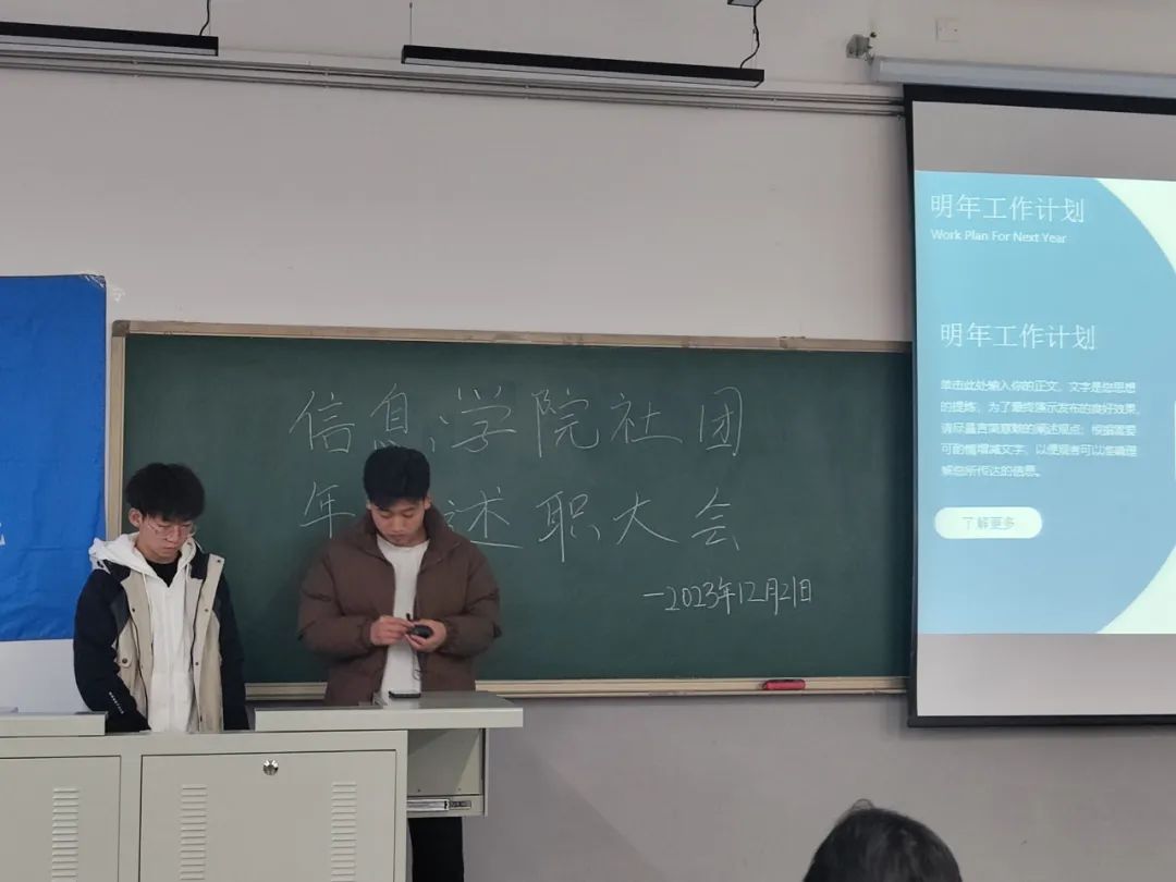 为充分发挥学生社团在学生综合素质培养和校园文化建设中的重要作用,培养团队合作意识,丰富校园文化,营造良好的社团风气。信息科学与技术学院学生社团工作部于12月21日在c303开展社团2023年度述职大会。信息科学与技术学院学生社团工作部指导老师李坤担任本次述职汇报评委,学生社团工作部社管部部长唐铭谦主持,八大社团各社长参加本次年终述职汇报。