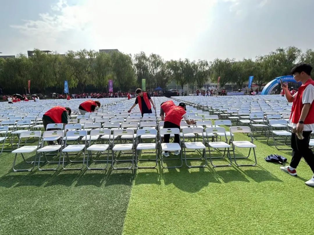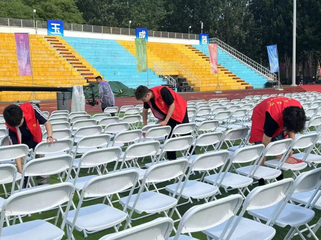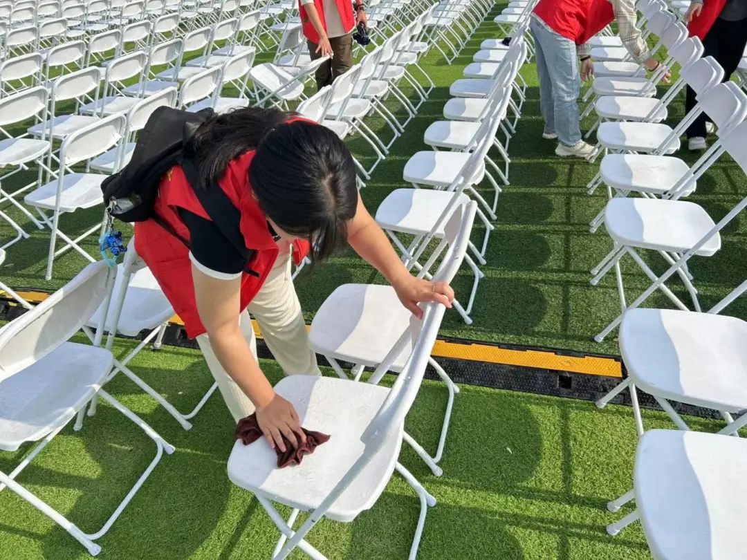细雨轻洒,却未曾打湿红衫志愿者们的热情。他们手持清洁工具,穿梭在会场的每一个角落,细心地擦拭着每一把座椅,确保每一位毕业生都能在一个整洁、温馨的环境中,感受这一人生的重要时刻。