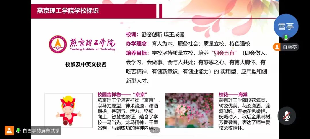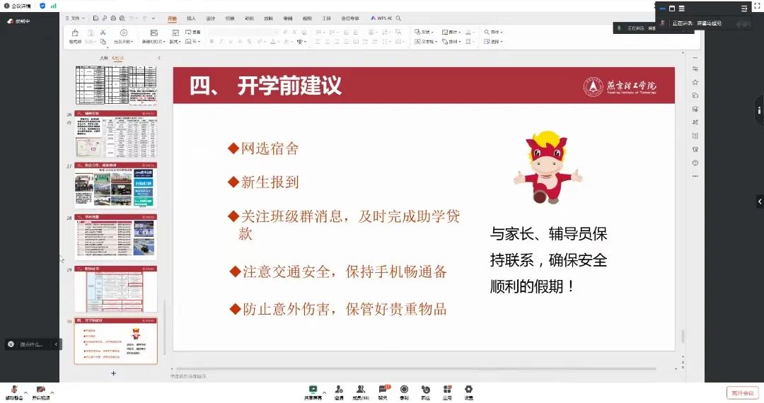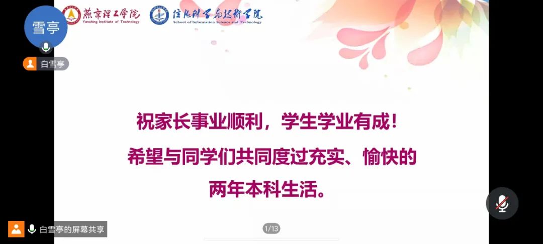 新生辅导员马超男、白雪亭分别从学院的办学理念、专业设置、师资力量、人才培养等方面介绍了学院的整体情况,并结合学术成果、学生实践活动、升学深造发展等方面的情况,对学生的成长之路进行了细致规划。另外,对于网选宿舍的情况进行说明,讲解新生入学相关事宜及注意事项,叮嘱出行安全。希望家长更多关心学生的学习生活和全面发展,同时祝愿广大新生在燕京理工学院,能够学有所得、得有所感、感有所进、进有所成。