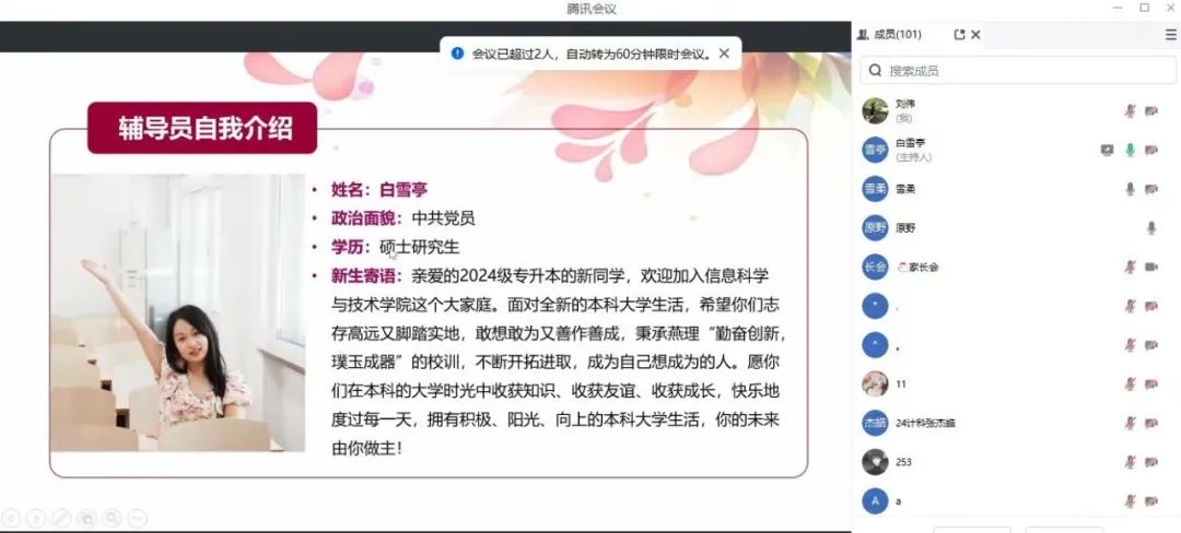 会议伊始,白雪亭老师首先对2024级新生和家长表示热烈欢迎,随即介绍了2024级新生辅导员以及学院学生基本情况和新生录取情况。