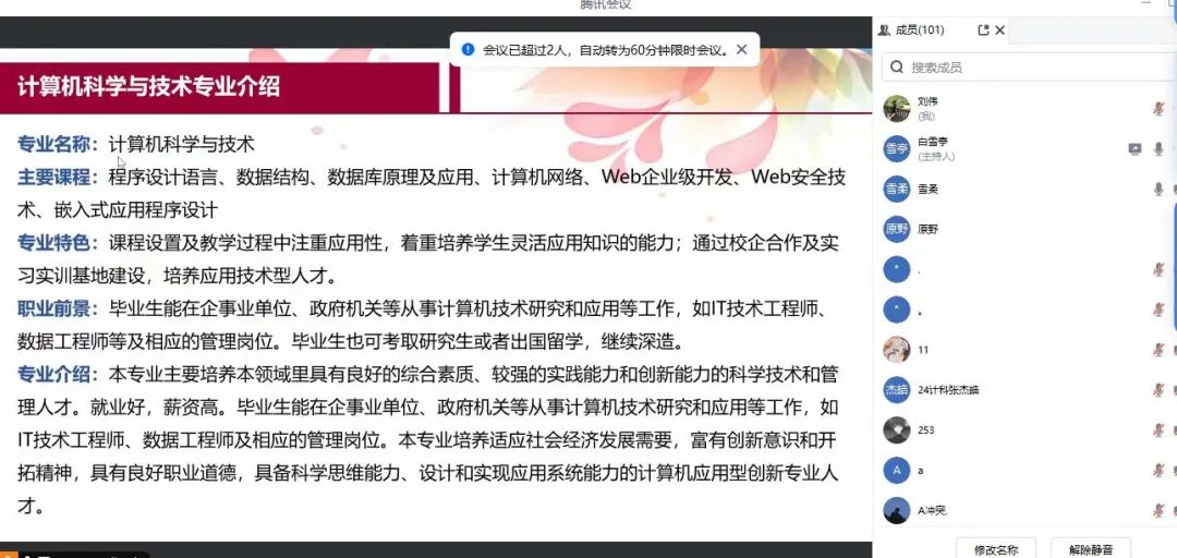 为了构建良好的家校沟通桥梁,进一步加强新生家长对本学院的了解,形成齐抓共管教育合力,创造良好的育人氛围。信息科学与技术学院于8月11日,采用线上的方式召开了计算机科学与技术专升本新生家长会。信息科学与技术学院党总支副书记刘伟、白雪亭老师和马超男老师以及2024级计算机科学与技术专升本新生家长共同参会。