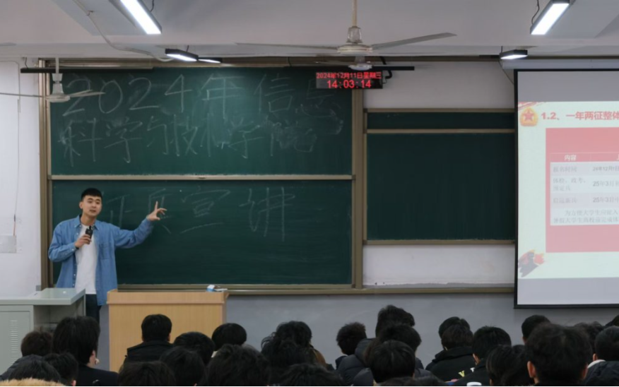 为深入贯彻落实习近平新时代中国特色社会主义思想和总体国家安全观,持续推进国防教育工作的深入开展,切实推动国家征兵政策落地生根,点燃莘莘学子投身军旅的激情之火。12月11日,信息科学与技术学院国防后备营负责人归金鑫于A201主持开展征兵宣讲主题活动。