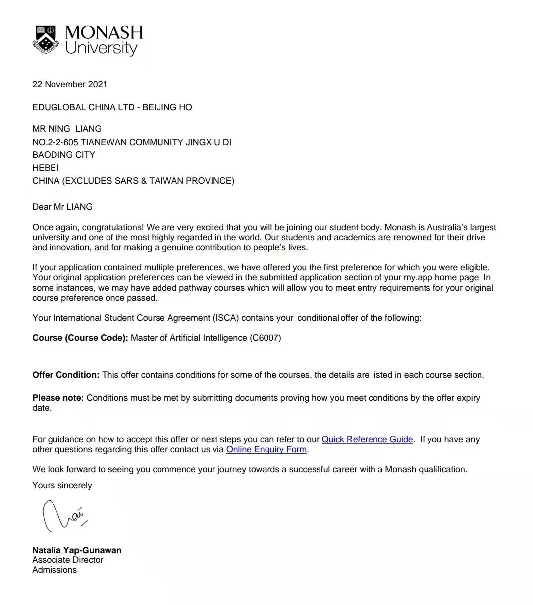 信息科学与技术学院计算机科学与技术专业1808班梁宁在学校“本(专)硕直通项目”培养下,获得澳大利亚昆士兰大学、英国诺丁汉大学以及澳大利亚莫纳什大学,三所世界名校offer。有人说青春是无拘无束的欢腾;也有人说青春是放手一搏的坚持;但对于梁宁同学来说,青春就是不顾一切的努力与奋斗,他用行动证明什么是真正的青春。