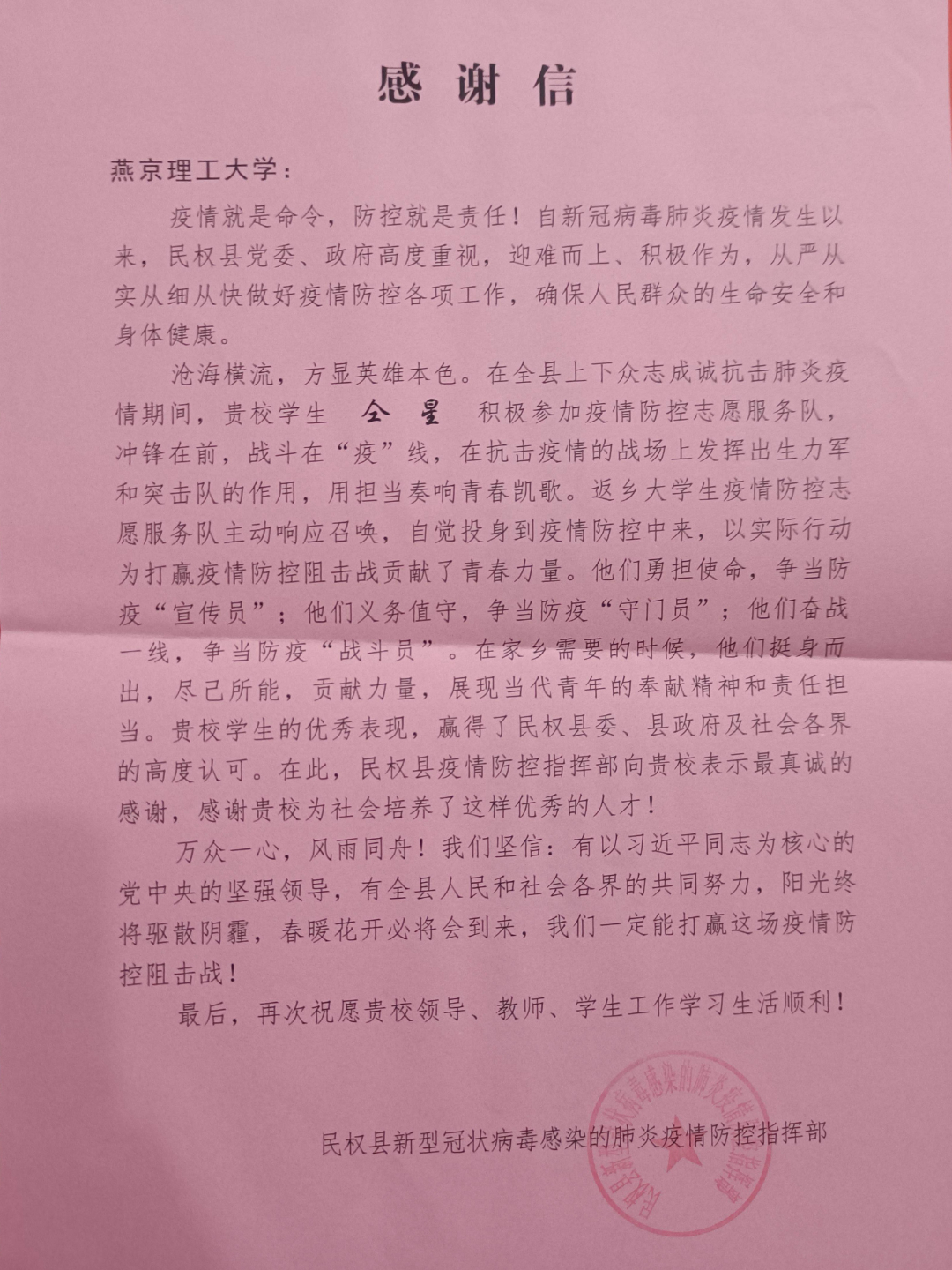 在这场没有硝烟的战争里,全国人民众志成城,坚决打赢这场疫情阻击战。疫情就是命令,防控就是责任,作为燕理新青年,我们应将责任扛在肩上,用行动书写担当,把有限的青春,投入到无限的为人民服务中去。