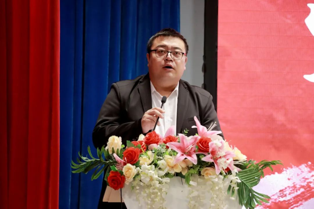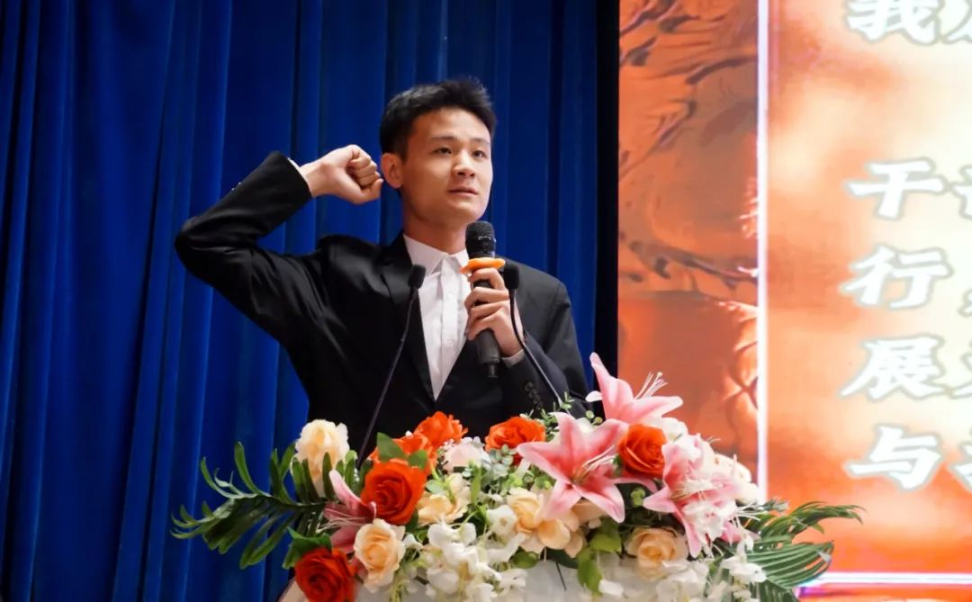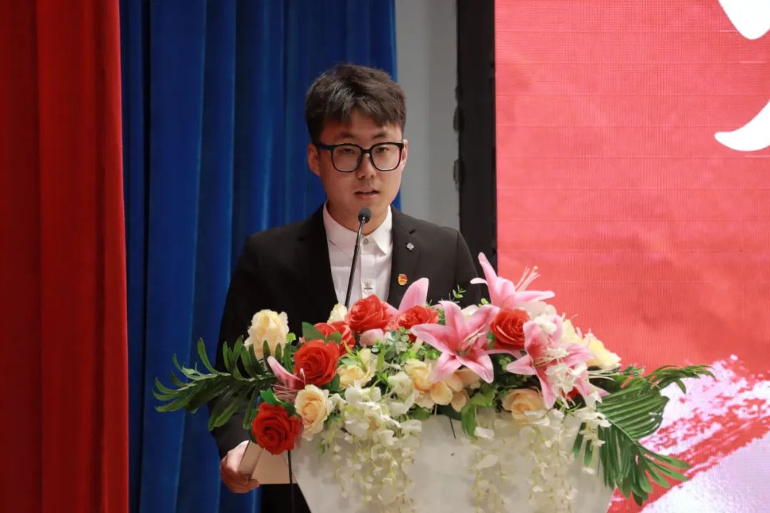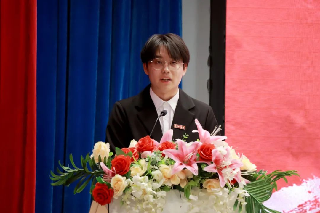 第十九届团总支学生第一副书记侯丙钧代表学生组织干部发言。回顾往昔,侯丙钧对上一届学生组织干部带领下学院取得的优异成绩表示敬意。立足当下,提出对新一届工作设想与决心。他围绕“积极开展干部培训、切实加强学生组织建设,传承学院优良传统、勇于突破创新,丰富第二课堂活动、建设多元校园文化,常存感恩之心、 努力拼搏奋斗”这四点展开阐述,帮助新一届学生组织干部更好地开展工作奠定基础。最后,侯丙钧代表第十九届全体学生组织干部许下庄重承诺:将以拼搏为笔、勤奋作墨,在新一程征途中挥洒汗水、躬身实干,续写组织华章,镌刻属于这一届的独特故事,助力学院学生工作迈向新高度。