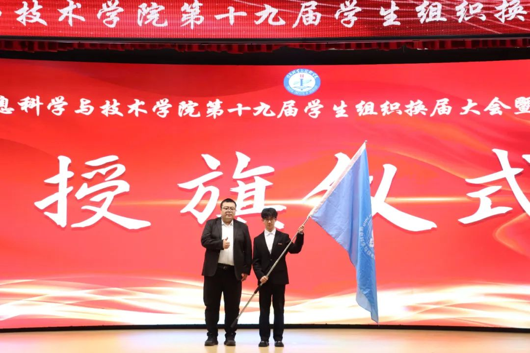 大会进行庄严的授旗仪式。信息科学与技术学院朱雷书记郑重地将承载着传承与信念的旗帜递交到学生组织代表李海博手中。这面旗帜是信息科学与技术学院的精神象征,凝聚着各个学生组织的团结与合作。此刻授旗,是使命交接,更是精神赓续。新一届学生干部接旗而立,肩负起沉甸甸责任,将“为同学服务”宗旨铭刻于心,誓在学业精进、工作实干中当先锋、作表率,传承学院优良传统,让奋进作风代代相继、熠熠生辉。