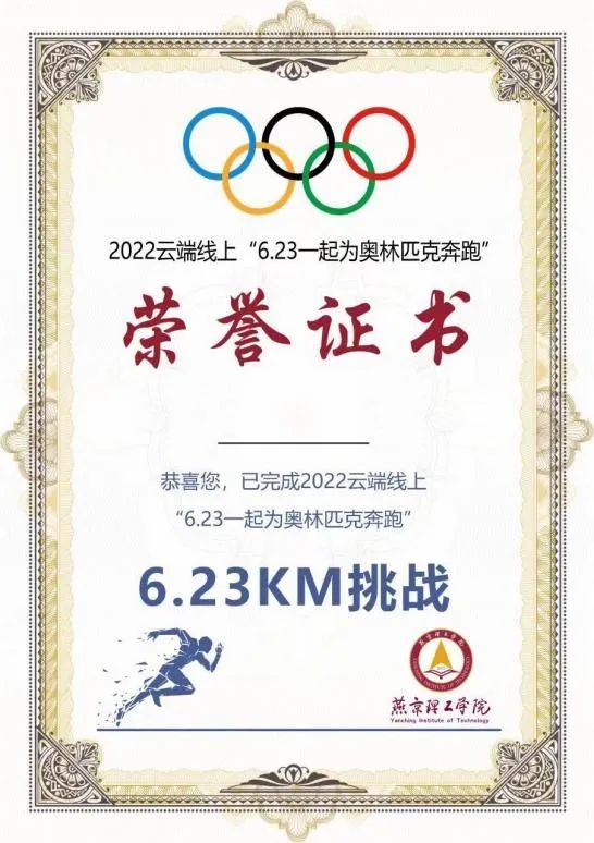 6月23日,第三十六个国际奥林匹克日来临之际,燕京理工学院发起“一起为奥林匹克奔跑”主题跑步活动,通过云上约跑、线上线下共跑、6.23公里打卡分享等形式传递奥林匹克精神,推广奥林匹克运动,践行“在燕理,体育无处不在”的运动理念。