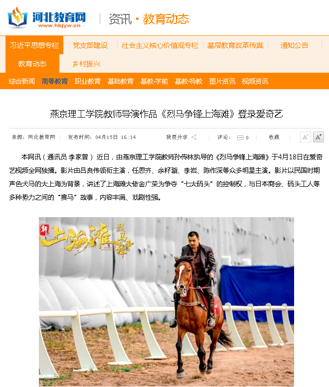【河北教育网】燕京理工学院教师导演作品《烈马争锋上海滩》登录爱奇艺