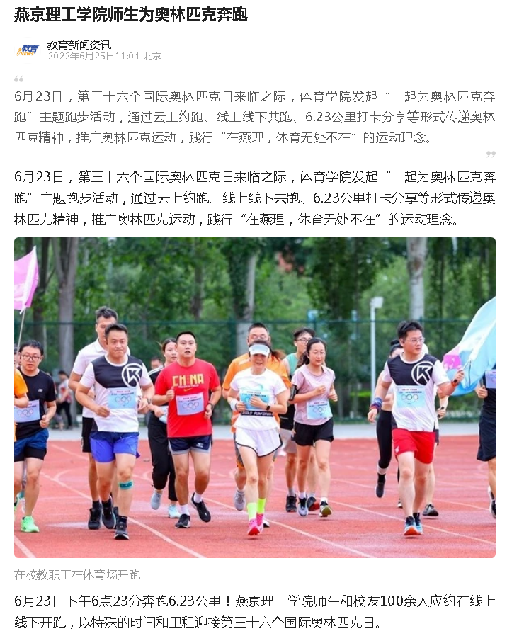 6月23日,第三十六个国际奥林匹克日来临之际,体育学院发起“一起为奥林匹克奔跑”主题跑步活动,通过云上约跑、线上线下共跑、6.23公里打卡分享等形式传递奥林匹克精神,推广奥林匹克运动,践行“在燕理,体育无处不在”的运动理念。