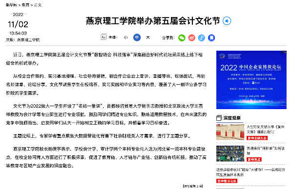 近日,燕京理工学院第五届会计文化节暨“数智助会 科技强审”深度融合新时代论坛采用线上线下相结合的形式举办。
