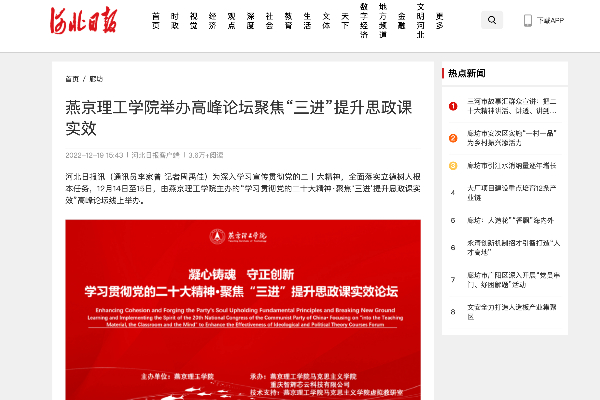 为深入学习宣传贯彻党的二十大精神,全面落实立德树人根本任务,12月14日至15日,由燕京理工学院主办的“学习贯彻党的二十大精神·聚焦‘三进’提升思政课实效”高峰论坛线上举办。