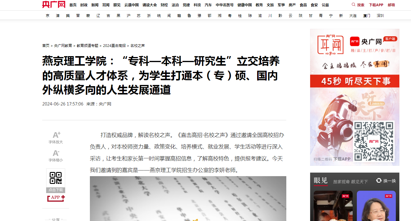 【央广网】燕京理工学院:“专科—本科—研究生”立交培养的高质量人才体系,为学生打通本(专)硕、国内外纵横多向的人生发展通道