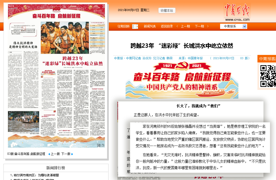 燕理学子张雅晶被中国青年报作为抗洪精神典型进行报道