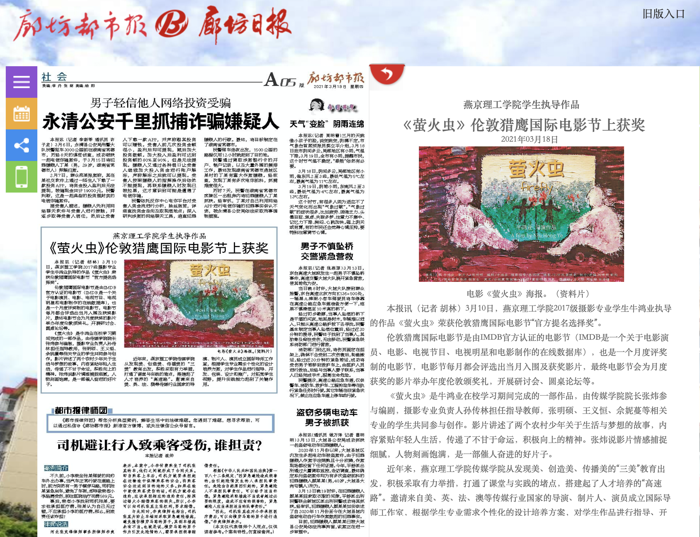 【廊坊都市报】《萤火虫》伦敦猎鹰国际电影节上获奖