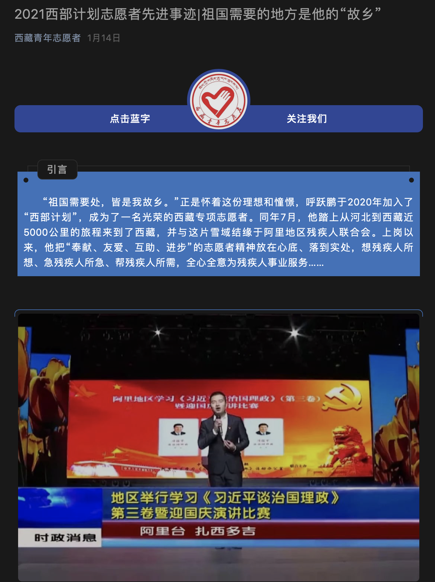 “祖国需要处,皆是我故乡。”正是怀着这份理想和憧憬,呼跃鹏于2020年加入了“西部计划”,成为了一名光荣的西藏专项志愿者。同年7月,他踏上从河北到西藏近5000公里的旅程来到了西藏,并与这片雪域结缘于阿里地区残疾人联合会。上岗以来,他把“奉献、友爱、互助、进步”的志愿者精神放在心底、落到实处,想残疾人所想、急残疾人所急、帮残疾人所需,全心全意为残疾人事业服务……