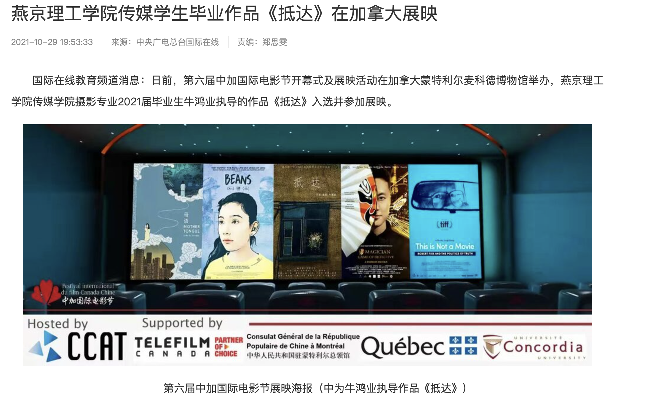 【国际在线】燕京理工学院传媒学生毕业作品《抵达》在加拿大展映