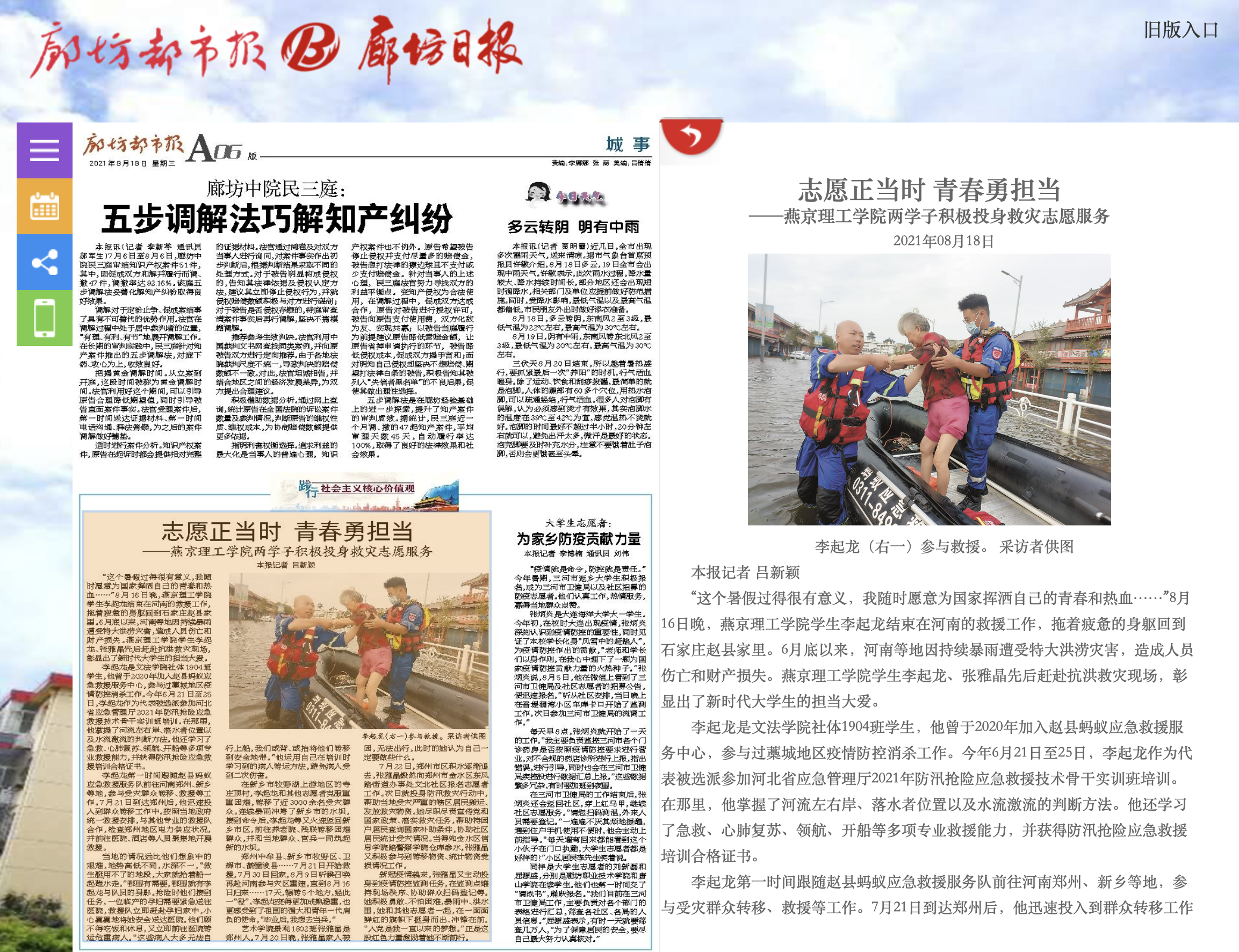 【廊坊都市报】燕京理工学院两学子积极投身救灾志愿服务