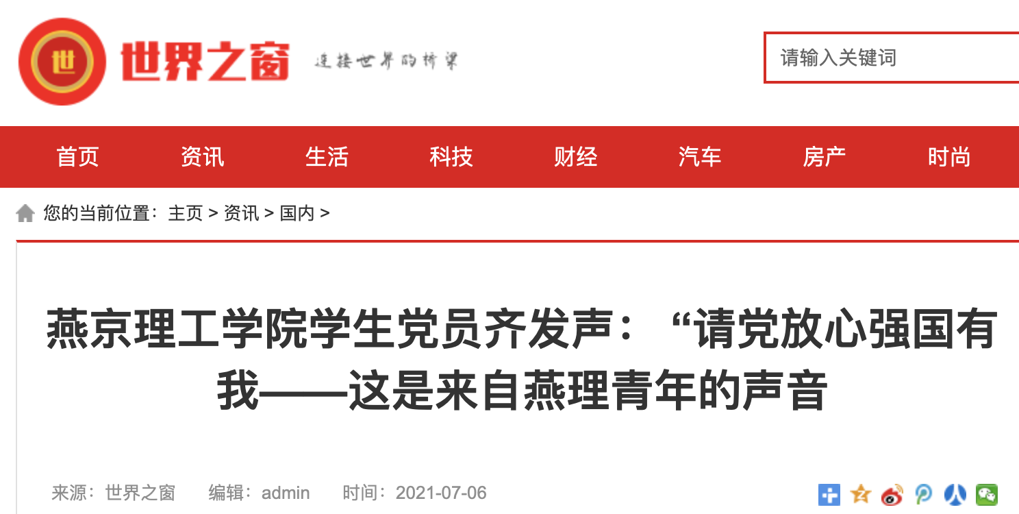 【世界之窗】燕京理工学院学生党员齐发声: “请党放心强国有我——这是来自燕理青年的声音