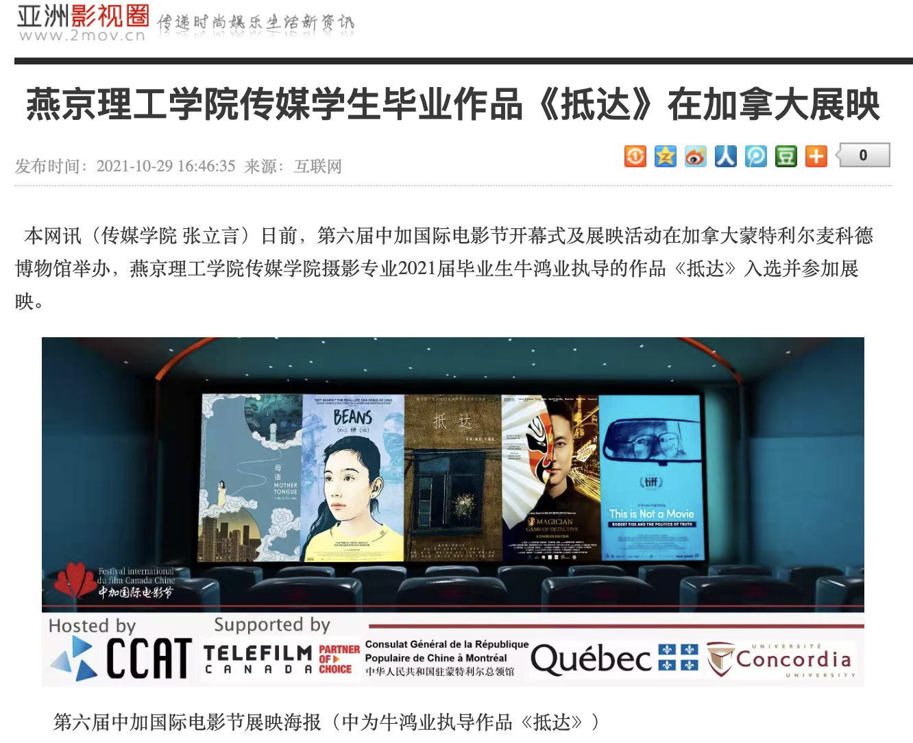 【亚洲影视圈】燕京理工学院传媒学生毕业作品《抵达》在加拿大展映