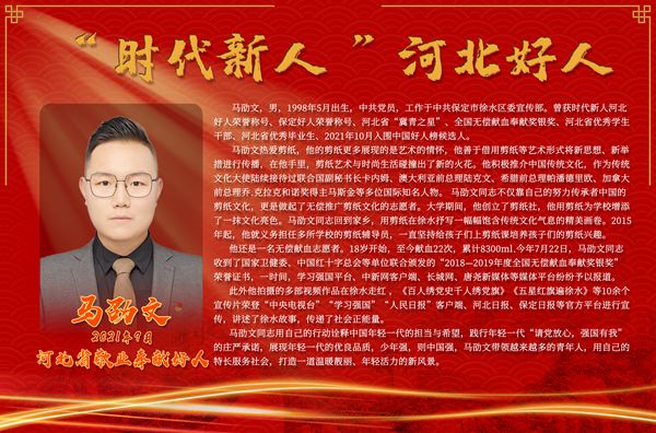 本网讯(工学院 宋梓洋)马劭文,中共党员,2020年毕业于我校高分子材料与工程专业,现工作于中共保定市徐水区委宣传部。曾获全国无偿献血奉献奖银奖、时代新人河北好人荣誉称号、保定好人荣誉称号、河北省“冀青之星”、河北省优秀学生干部、河北省优秀毕业生、河北省“破题攻坚”三等奖,保定好网民、徐水好网民、徐水好人等荣誉,2021年10月入围中国好人榜候选人。他自幼热爱剪纸艺术,热衷弘扬传统文化,到西安、石家庄、上海等地拜访名师,苦心钻研剪纸艺术,多次获得国家、省、市级荣誉,他的剪纸作品作为接待外国友人馈赠礼品,弘扬了中华传统文化。2015年开始,他多年如一日地深入学校、社区,义务宣传、培训剪纸文化,受到了群众的广泛好评。