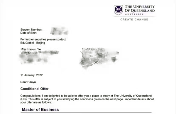 叶皓宇获得昆士兰大学offer