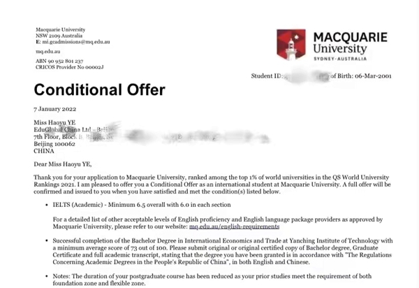 叶皓宇获得麦考瑞大学offer