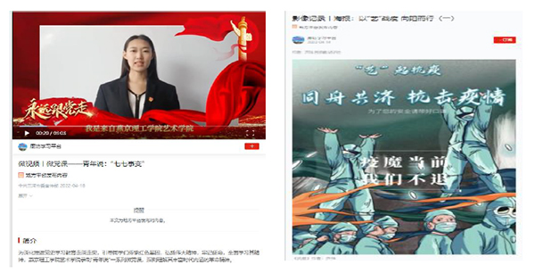 以艺术实践的形式,推进党史学习教育走深走实。学院各支部引导广大师生以艺术实践的形式传承红色基因,弘扬伟大精神,艺术学院录制“青年说”系列微党课、我的大熊猫故事绘画作品、以“艺”抗疫影像作品共计28项在学习强国平台展出,发挥良好的示范效应。在疫情防控志愿服务中,近2年学院共有989人次获得各级政府的优秀志愿者称号,在2022年寒假期间学院有780余名师生参加疫情防控、志愿服务、2022年北京冬奥会、冬残奥会等活动,贡献青春力量。
