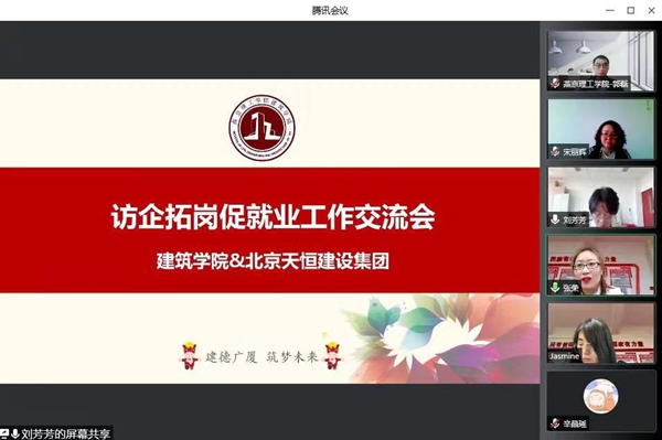 6月13日,建筑学院院长宋丽辉与党总支书记郭磊先后与北京天恒建设集团、北京华厦工程项目管理公司的负责人举行了线上访企拓岗促就业工作交流会。受疫情影响,今年毕业生就业工作面临巨大考验,为供需双方都带来了极大的不便。此次会议旨在为更多的毕业生搭建交流平台,精准推荐岗位,积极推动就业,最大可能的为毕业生拓宽就业渠道。