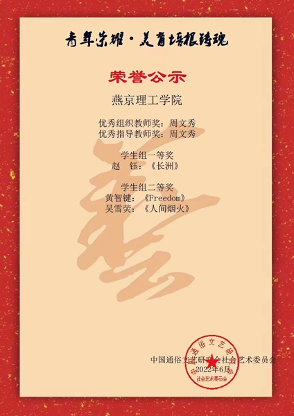 本网讯(传媒学院 张立言)近日,在第二届“青年荣耀·美育培根铸魂”新时代青少年作品展演活动中,传媒学院赵钰同学的作品《长洲》获得学生组一等奖,吴雪荧同学的作品《人间烟火》、黄智键同学的作品《Freedom》获得学生组二等奖,同时周文秀老师获得优秀组织教师奖和优秀指导教师奖。