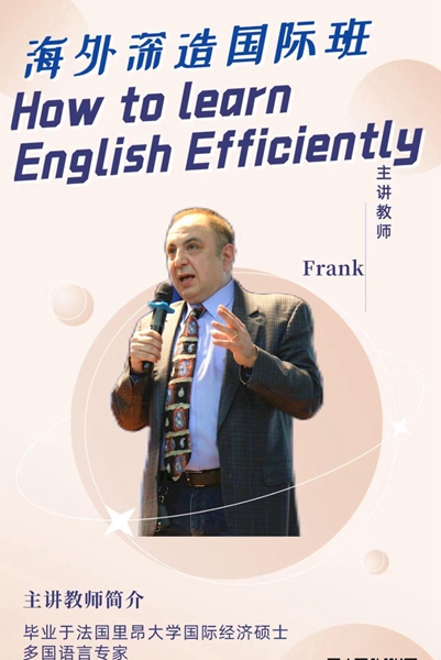 9日,法国里昂大学国际经济硕士、多国语言专家Frank老师以“How to learn English Efficiently”为主题进行了讲座。他循序渐进地展示了学习英语的主要方法和途径,认为英语学习与生活息息相关,在生活中广泛运用英语可以得到更有效提升。