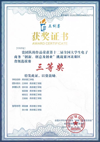 学生作品获全国大学生电子商务挑战赛河北省选拔赛三等奖