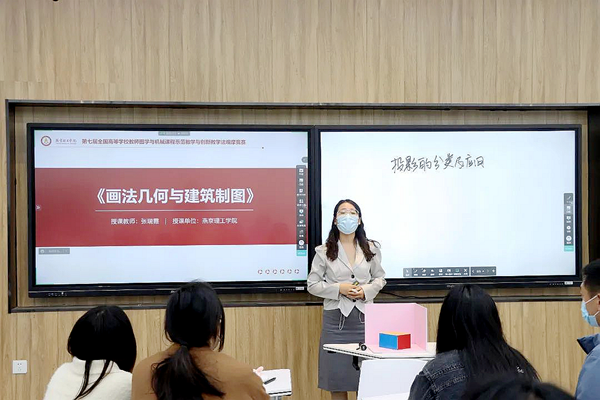 张瑞霞老师分享了《画法几何与建筑制图》,并从三个方面分享心得:第一,态度方面,无论是比赛还是平时的课程,老师们都要有积极认真的态度。第二,学习方面,线上线下的教学资料都要不断去查阅优化,吸取他人的意见。第三,内容选取方面不要太过雷同,要有自己的特色,在有趣的同时有一个合理的表达。第四,时间把控,无论是比赛还是日常教学中都要对时间有一个精准的把控。