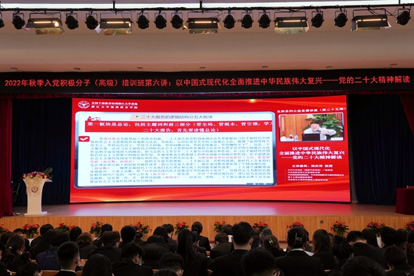 本网讯(党委办公室 崔皓然 金志成)2022年11月8日,燕京理工学院2022年秋季入党积极分子(高级)培训班第六讲在学校报告厅如期举行,此次培训采用直播方式,收听收看求是云学堂名师系列公益直播讲座第二十五期,主题是:《以中国式现代化全面推进中华民族伟大复兴——党的二十大精神解读》。由中央党校(国家行政学院)一级教授、中央党校专家工作室领衔专家、马克思主义研究和建设工程首席专家韩庆祥教授主讲。
