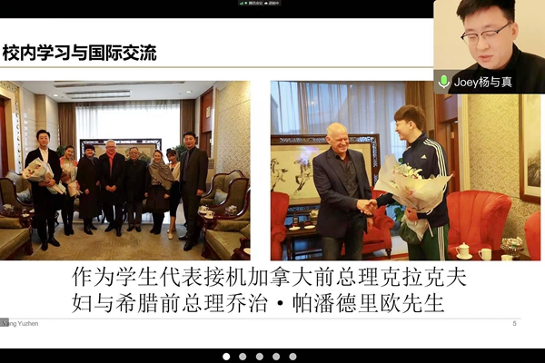 首先,杨与真分享了留学故事。从燕京理工学院本科毕业后,他又就读于英国伦敦大学学院。他提到到,出国前,他曾作为学生代表接机加拿大前总理克拉克夫妇与希腊前总理乔治·帕潘德里欧先生,于18年参加联合国人口基金“一带一路”青年领导力项目,又与易烊千玺同作为青年学生代表,参加联合国经济社会理事会青年论坛。他鼓励燕理的学弟学妹们要到更广阔的舞台上拓展视野。