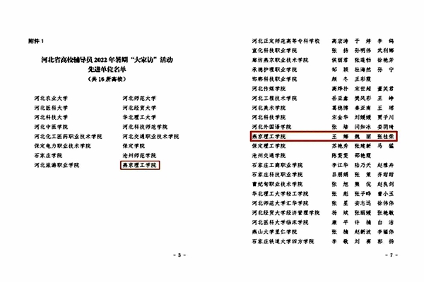 本网讯(学生处 王奥然 朱秋宜)按照《河北省教育厅关于开展全省高校辅导员2022年暑假“大家访”活动的通知》相关要求,为形成家校育人合力,促进学生全面成长成才,我校暑期组织开展了2022年暑期“大家访”活动。燕京理工学院荣获河北省高校辅导员2022年暑期“大家访”活动先进单位,其中,王娜、魏丽、张桂荣三位辅导员在“大家访”活动中表现突出,被评为河北省高校辅导员2022年暑期“大家访”活动先进个人。