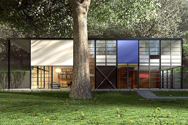 伊姆斯住宅——建筑外立面采用黑色钢铁框架,使用透明和半透明两张玻璃,并搭配三原色蓝色、红色、黄色及基础颜色黑色和白色镶板——应用蒙德里安标志性元素,生动简约。