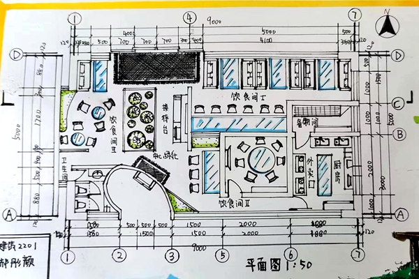 4.由泡泡图绘制平面图。考虑建筑功能,设置1~2人,3~4人,7~8人就餐空间;在出入口处设置绿化空间,避免进入后直面收银台刻板印象;空隙处增加盆景,提升室内氛围。