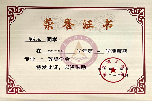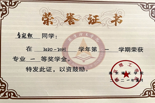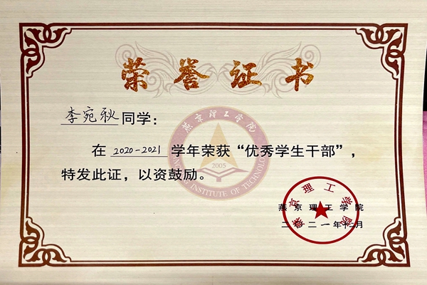 在学习上,她严格要求自己,刻苦钻研、勤奋好学、态度端正、目标明确,曾两次获得专业一等奖学金,一次获得专业二等奖学金,并在“喜迎国庆,欢度中秋”征文大赛中获得了三等奖。在学科竞赛方面,曾获得“广厦杯”全国冰雕艺术大赛优秀奖、建筑文化节构造大赛三等奖。但是她并未满足于现状,积极学习,不断提高自己的学习效率。同时,李宛秋分享她的学习经验:“兴趣是最好的老师,当你对你所做的一切感兴趣的时候,那么你将会有源源不断的动力去支持你完成它。”李宛秋不仅在学习上十分优秀,在其他方面,也取得了不菲的成绩,在大一期间,她作为导员助理,积极为班级做出贡献,并带领班级获得了燕京理工学院第三届班级风采大赛第三名的好成绩。大二时,她还获得了优秀学生干部、优秀共青团干部标兵、等诸多荣誉。