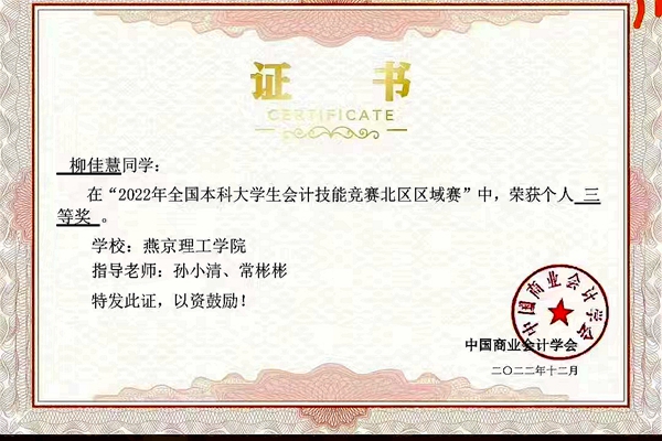 柳佳慧同学曾获外研社阅读大赛英语竞赛三等奖、SAP创新创业综合模拟竞赛获三等奖、2022年全国高校商业精英挑战赛“精创教育杯”创新创业竞赛区域赛荣获二等奖、全国高校商业精英挑战赛“精创教育杯”创新创业竞赛区获得国赛一等奖、2022年获得全国本科大学生会计技能竞赛区域个人赛中获得区域赛三等奖、2022一带一路暨金砖国家技能发展与技术创新大赛区域赛三等奖等数个奖项,聊起她参加竞赛的原因,柳佳慧同学认为参加竞赛可以结交很多朋友,可以和老师交流,让自己在学术方面增长经验和知识,让自己的大学生活更加充实。对此她说:“参加的竞赛很多,但是每个竞赛的意义都是不一样的,每个竞赛都能得到不一样的体验。”