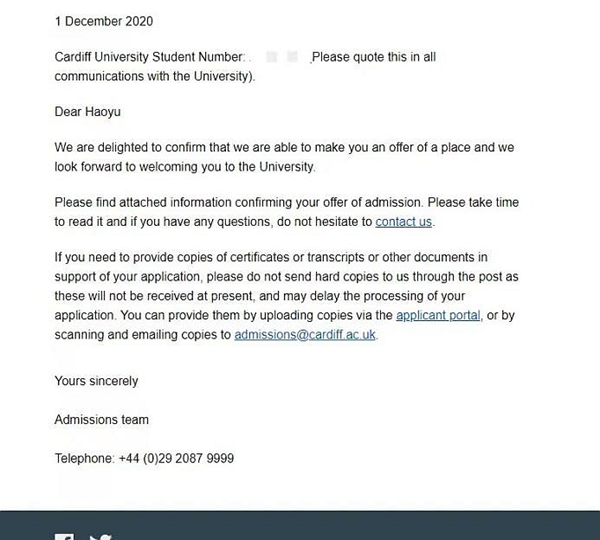 本网讯(智能工程学院 刘一泽)王浩宇是燕京理工学院2017级机械工程专业的学生,在他持之以恒的努力下,他获得了卡迪夫大学、拉夫堡大学、斯旺西大学的offer,经过他的仔细思量,他选择攻读卡迪夫大学高级机械工程专业的硕士研究生学位。