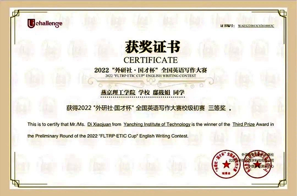 本网讯(会计学院 阴嘉诚)邸筱娟是燕京理工学院会计学院管理会计2202班的学生。她自入学以来,一直刻苦学习,追求进步,积极汲取知识。在短短的几个月里,她参加了多项比赛,包括2022年“外研社·国才杯”全国写作大赛和“用英语讲好中国故事”短视频比赛,并且获得了优异的成绩。