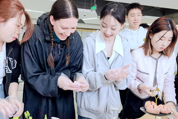 歌曲演绎过后,活动主持人又邀请两位艺术家与国际班的同学们一起感受中华饮食文化。中国人喜欢用饮食来传达情义,中式点心,讲究点之于心。艺术家们与同学们一起制作传统美食海棠酥,在品味独属于燕理文化的海棠美食中畅谈大学学习生活,展望美好精彩未来。客从远方来,多以茶相待。戏剧影视导演专业任艺青同学是国家中级茶艺师,她以茶会友,现场进行了茶艺表演,邀请艺术家和在场同学们一起品茗。