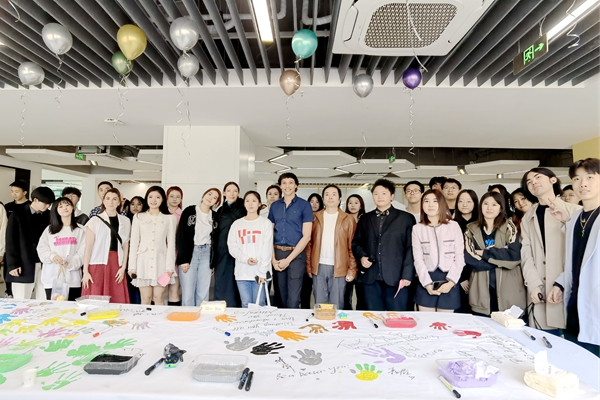 最后,同学们和艺术家们一起在象征友谊的画布上按下彩色手印,并用一张合照定格此时此刻的欢乐。